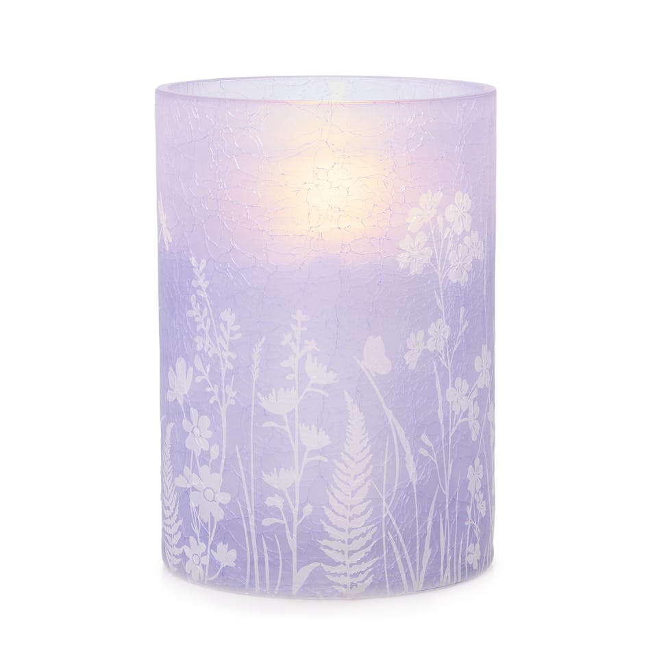 Get into the swing of spring with this botanical Jar Candle Holder, made of frosted glass with a periwinkle-colored spray finish.