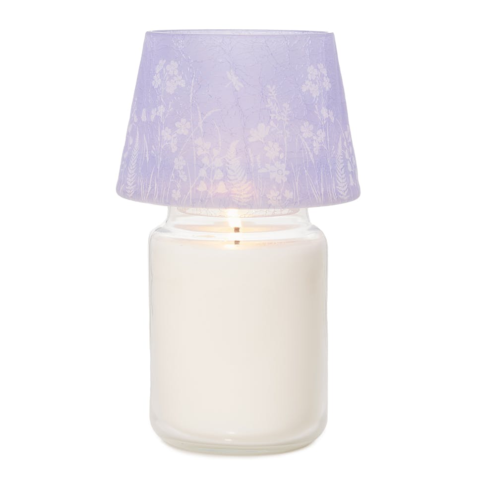 Get into the swing of spring with this botanical Jar Candle Shade, made of frosted glass with a periwinkle-colored spray finish.