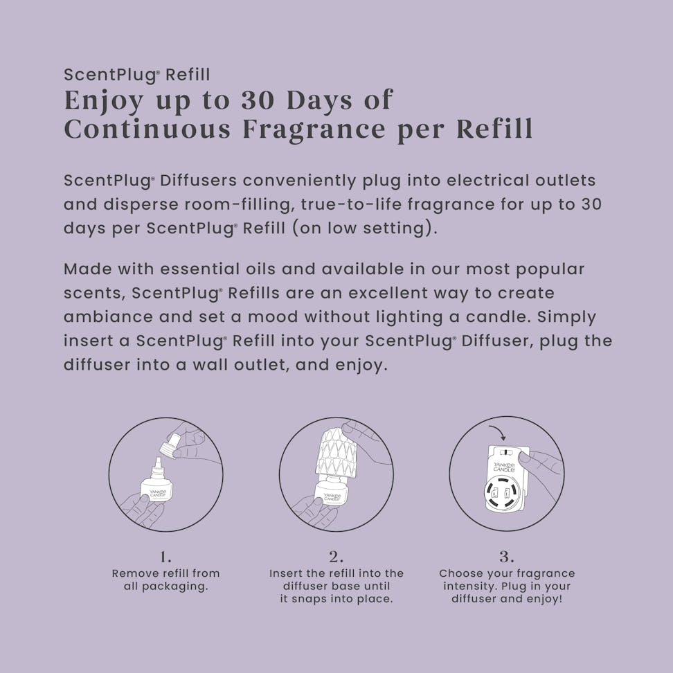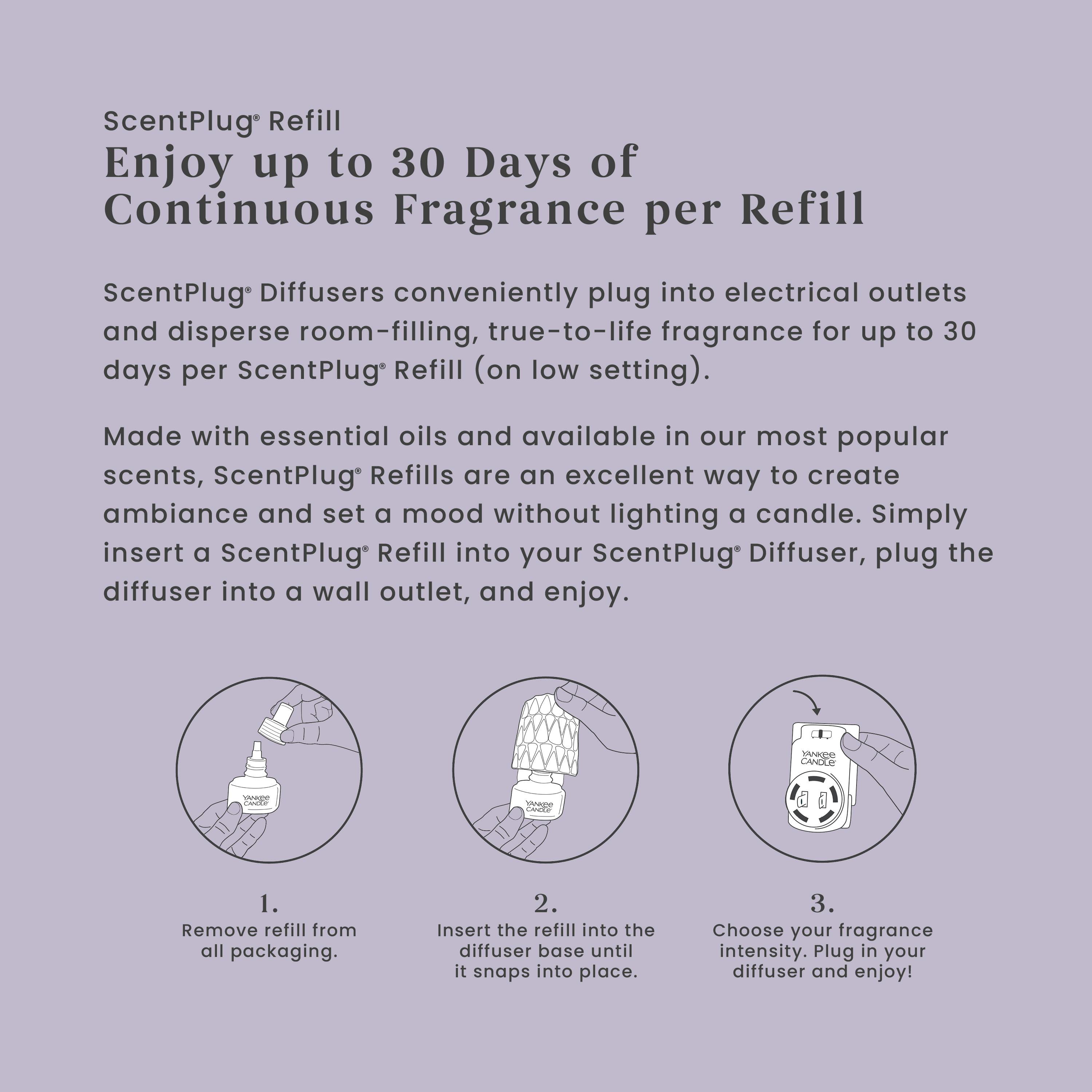 Come home to an inviting combination of personal style and continuous fragrance. Just insert this fragrance refill into a decorative ScentPlug® Fragrance Diffuser, plug it in, and you'll enjoy room-filling fragrance for up to 30 days. To use, simply remove the refill's cap and slide the bottle into the ScentPlug® Base until it snaps into place. Rotate the base's plug to match your outlet, keeping the ScentPlug® Fragrance Refill upright. When the oil disappears, it's time to replace!